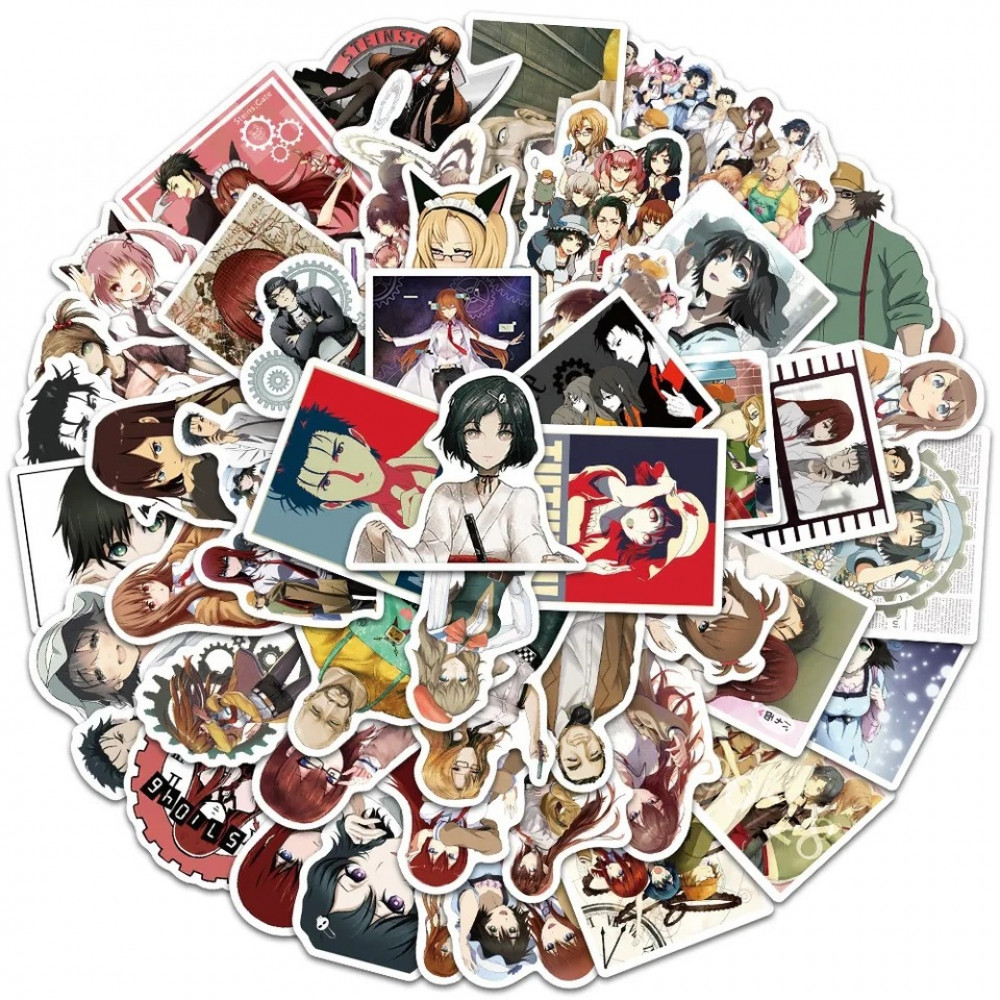 ملصقات أنمي شتاينز قيت تأتي مجموعة 50 ملصق غير متكرر ضد الموية الخفيفة ولا تترك أثر عند إزالتها. تتراوح أحجام الملصقات ما بين 3 إلى 8سم.