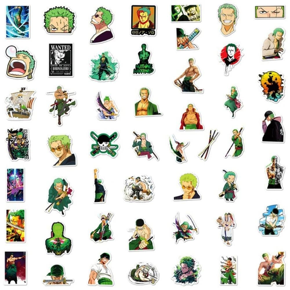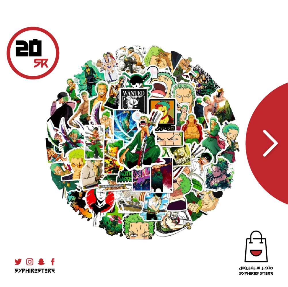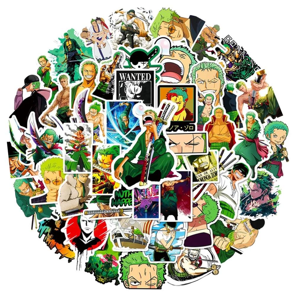 ملصقات شخصية رورونوا زورو من أنمي ون بيس تأتي مجموعة 50 ملصق غير متكرر تأتي جميعها على شكل مربع وتتراوح أحجامها من 3 إلى 7سم.