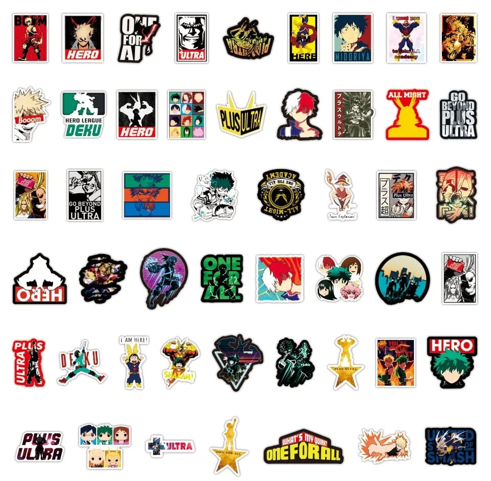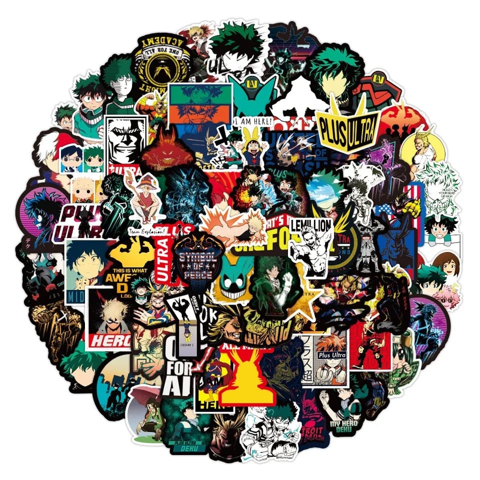 ملصقات الأنمي أكاديميتي للأبطال تأتي مجموعة 50-100 ملصق غير متكرر ضد الموية الخفيفة ولا تترك أثر بعد إزالتها، تتراوح أحجام الملصقات بين 3 إلى 8 سم.