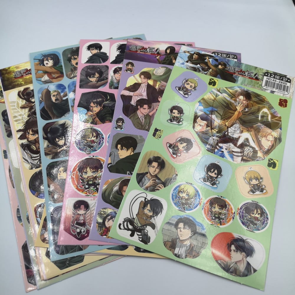 صفحة ملصقات عشوائية لأنمي هجوم العمالقة، تتراوح أعداد الملصقات في كل صفحة من 10 إلى 25 ملصق وهذا يكون حسب أحجامها فكلما كبرت كلما قلت الكمية في مقابل ملصق أكبر.