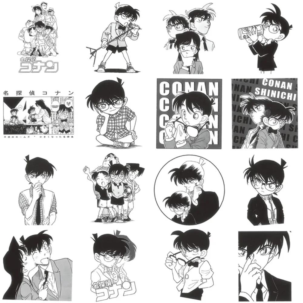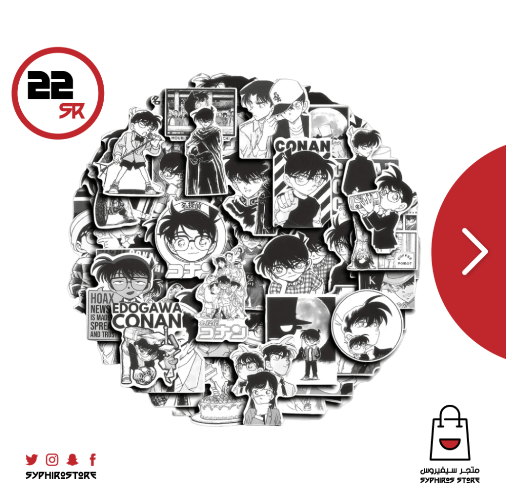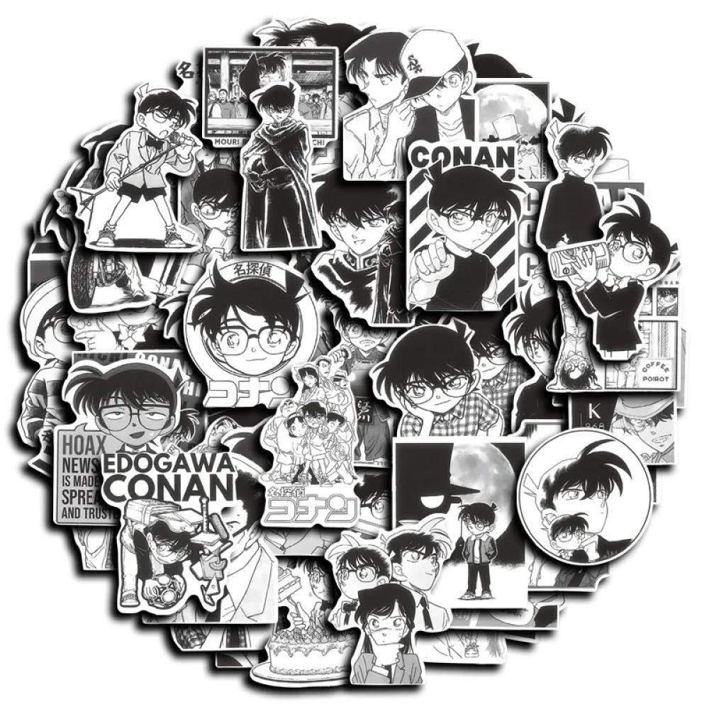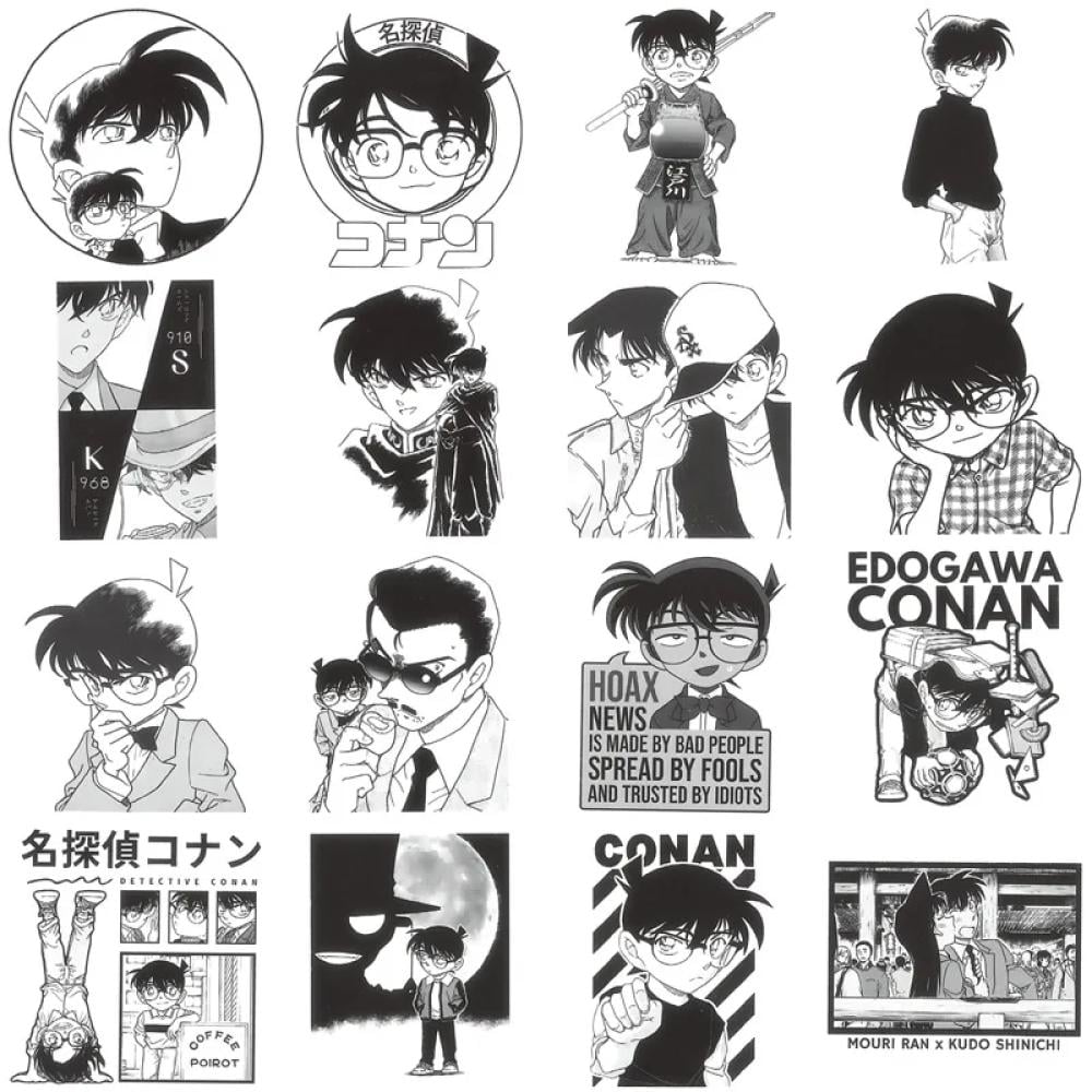 ملصقات أنمي المحقق كونان باللون الأبيض والأسود، تتراوح أحجام الملصقات من 3 إلى 7 سم.