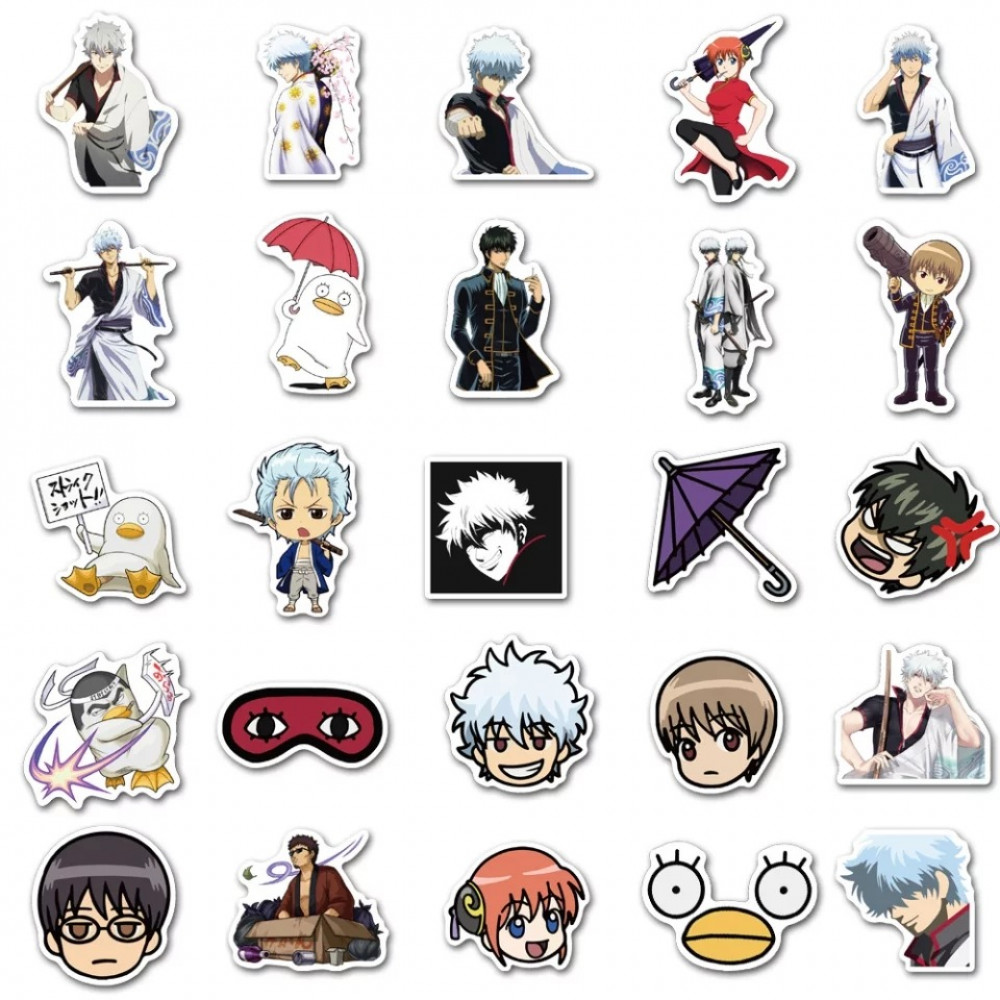 ملصقات أنمي قينتاما تأتي مجموعة 50 ملصق غير متكرر ضد الموية الخفيفة ولا تترك أثر بعد إزالتها، تتراوح أحجام الملصقات بين 3 إلى 10 سم.