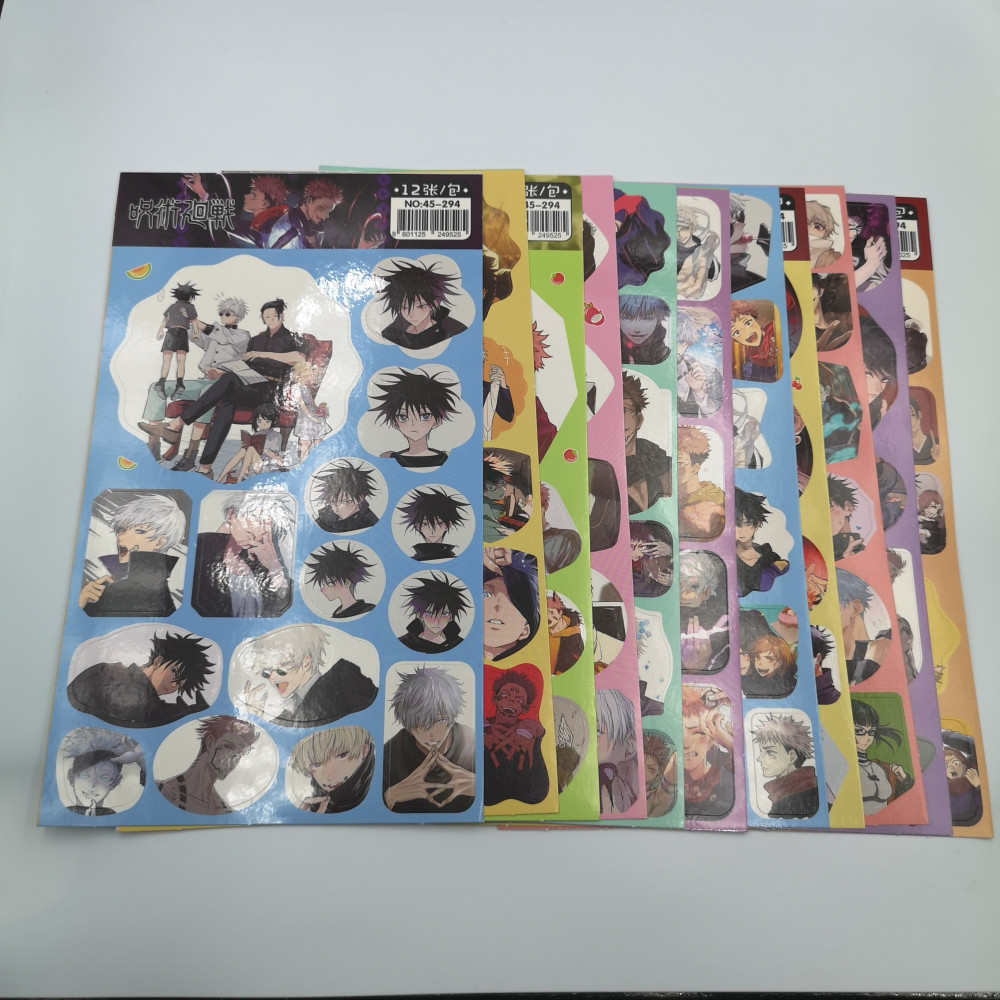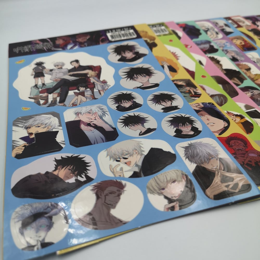 صفحة ملصقات عشوائية لأنمي جوجوتسو كايسن، تتراوح أعداد الملصقات في كل صفحة من 10 إلى 25 ملصق وهذا يكون حسب أحجامها فكلما كبرت كلما قلت الكمية في مقابل ملصق أكبر.