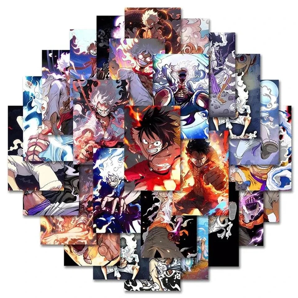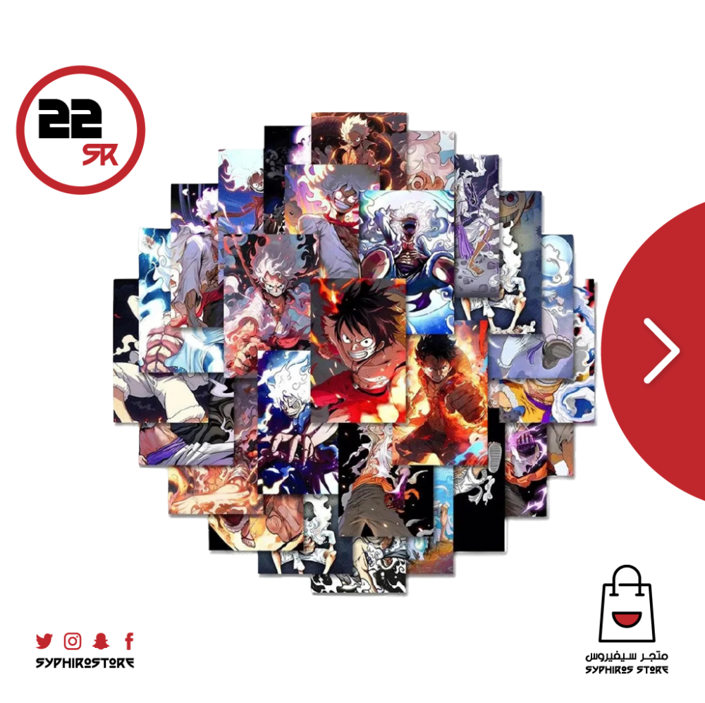 ملصقات أنمي ون بيس لشخصية لوفي وأغلبها للقير الخامس تأتي مجموعة 54 ملصق غير متكرر حجم جميع الملصقات 3سم في 4.5سم.