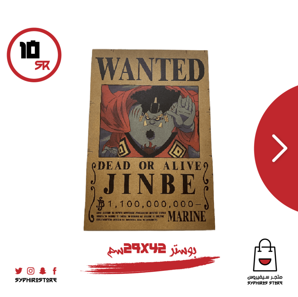 بوستر المطلوبين الخاص بشخصية جينبي من أنمي ون بيس. الارتفاع: 42 سمالعرض: 28.7 سمملاحظة:لا يأتي المنتج مع لاصق خلفي.