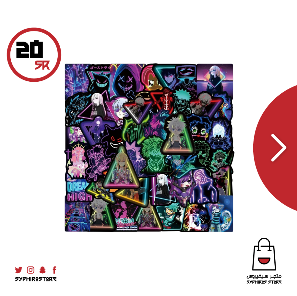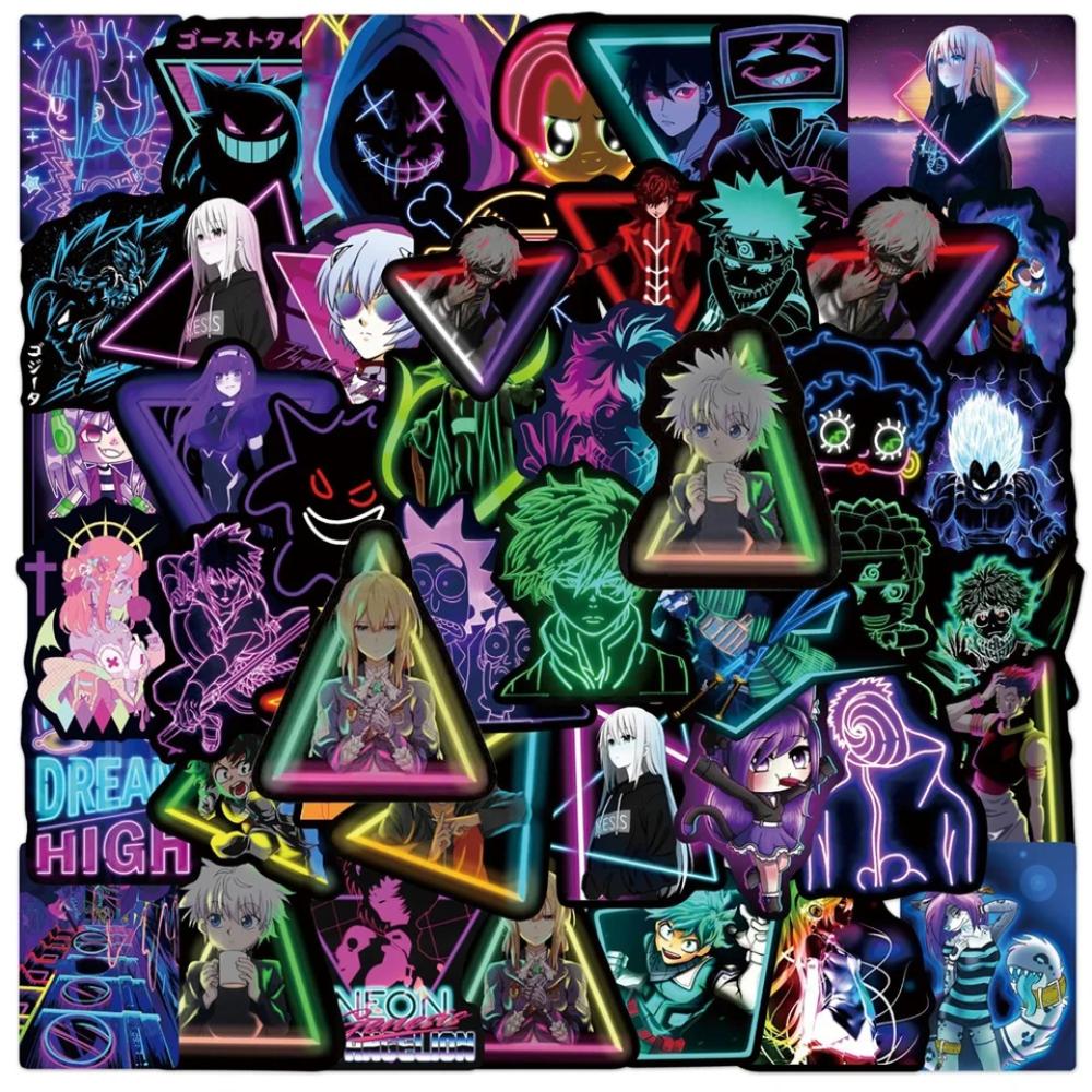 ملصقات تحمل شخصيات أنمي تصميم نيون تأتي مجموعة 50 ملصق غير متكرر ضد الموية الخفيفة ولا تترك أثر عند إزالتها وتتراوح أحجام الملصقات من 3 إلى 7 سم.