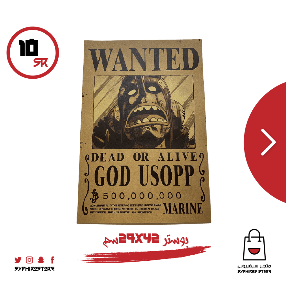 بوستر المطلوبين الخاص بشخصية اوسوب من أنمي ون بيس. الارتفاع: 42 سمالعرض: 28.7 سمملاحظة:لا يأتي المنتج مع لاصق خلفي.