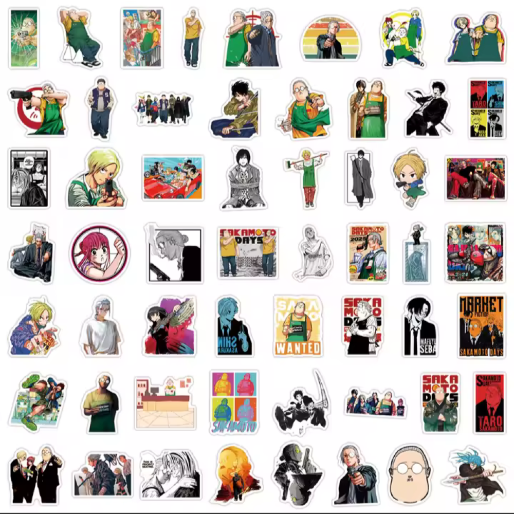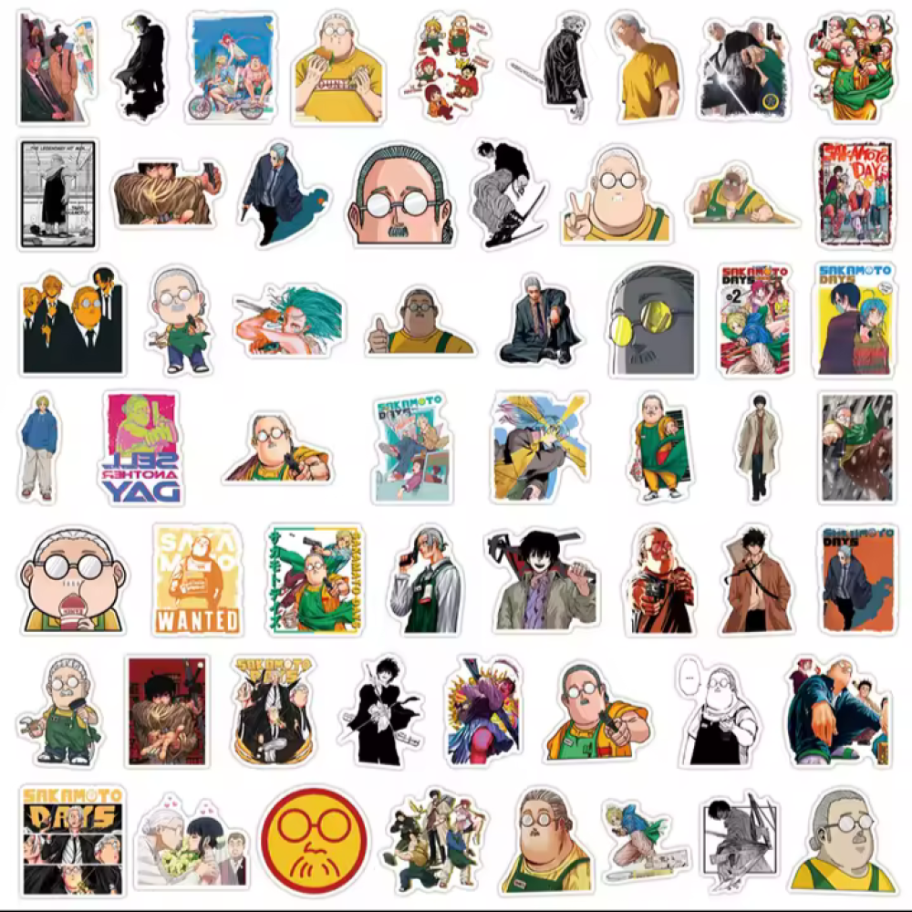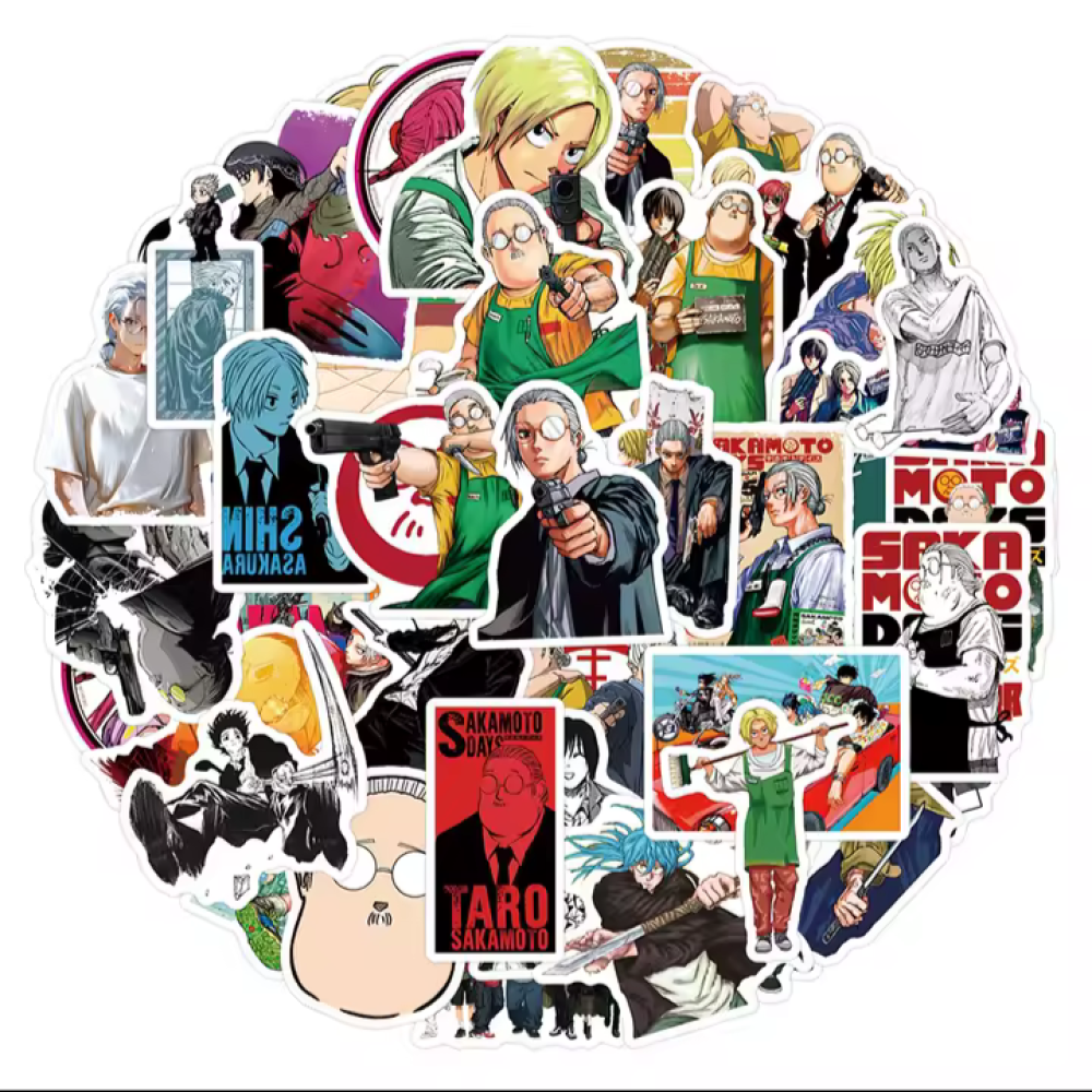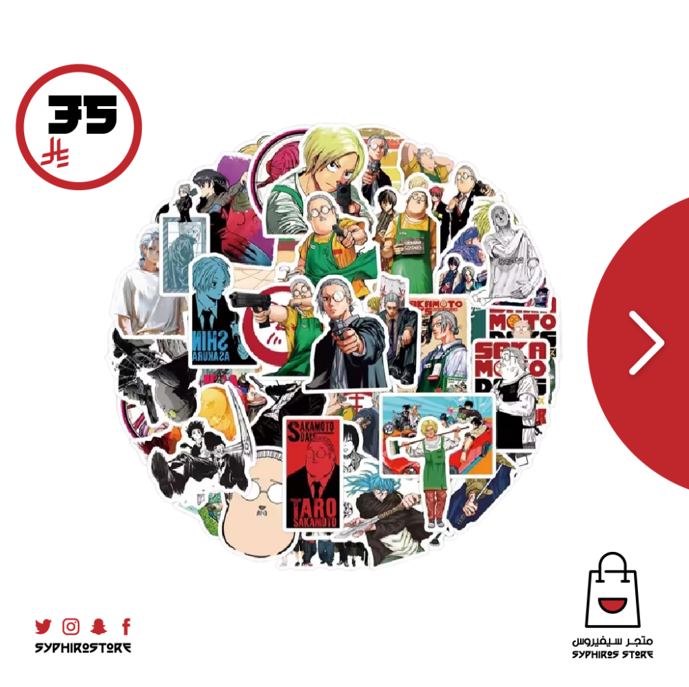 ملصقات أنمي أيام ساكاموتو تأتي مجموعة 50 - 100 ملصق غير متكرر ضد الماء الخفيف ولا تترك أثر عند إزالتها وتتراوح أحجام الملصقات من 3 إلى 7 سم.
