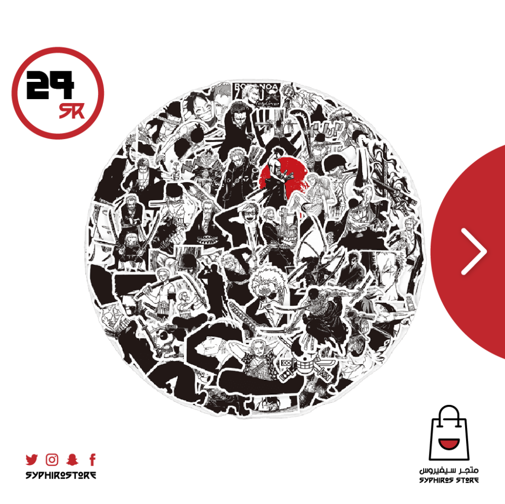 ملصقات شخصية رورونوا زورو من أنمي ون بيس تأتي مجموعة 75 ملصق غير متكرر باللونين الأبيض والأسود وتتراوح أحجامها من 3 إلى 7سم.