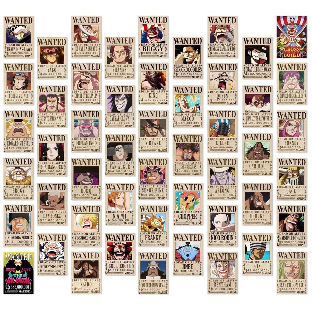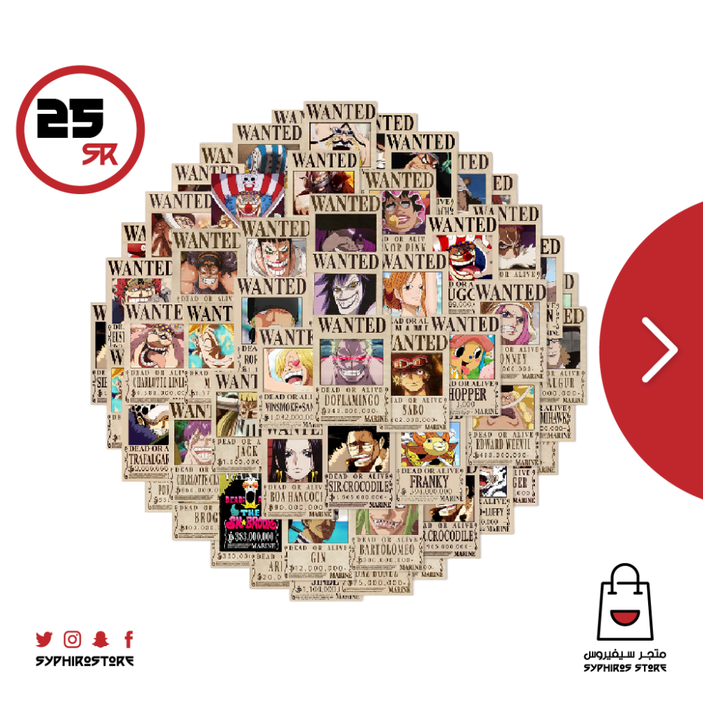 ملصقات المطلوبين من أنمي ون بيس تأتي مجموعة 50 ملصق غير متكرر بحجم ثابت 6.5سم في 4.5سم.