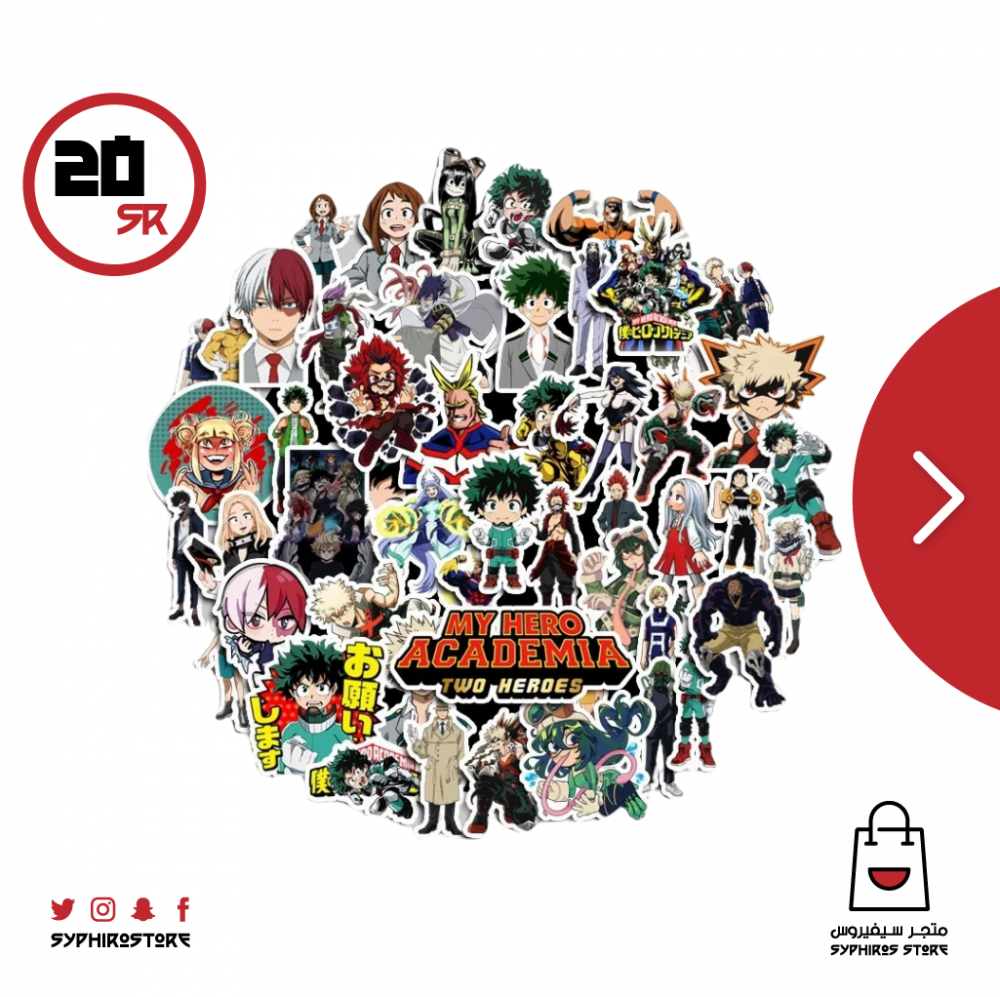ملصقات الأنمي أكاديميتي للأبطال تأتي مجموعة 50 ملصق غير متكرر ضد الموية الخفيفة ولا تترك أثر بعد إزالتها، تتراوح أحجام الملصقات بين 3 إلى 8 سم.