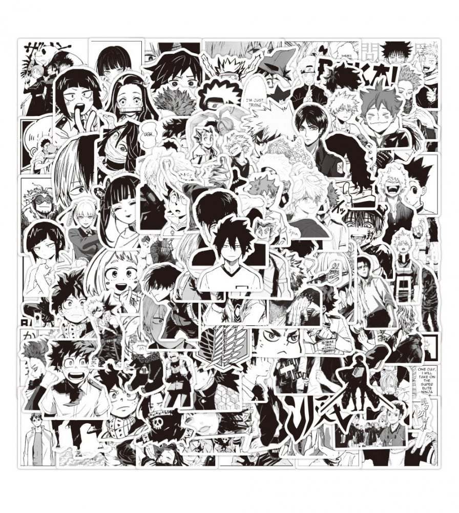 ملصقات أنميات متفرقة باللون الأبيض والأسود تأتي مجموعة 100 ملصق غير متكرر ضد الموية الخفيفة ولا تترك أثر عند إزالتها.